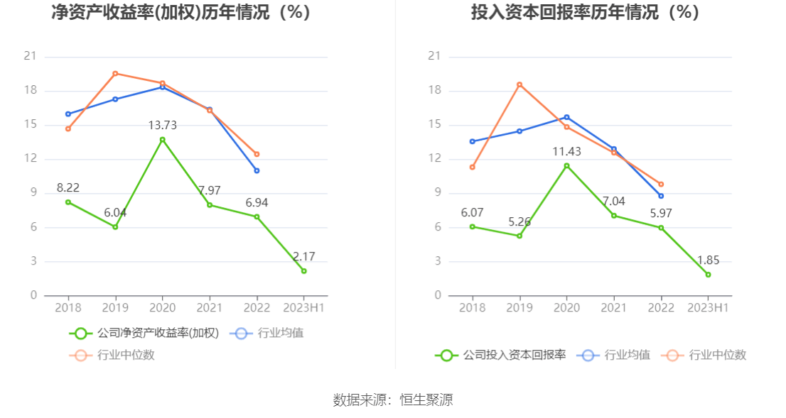 数据显示,2023年上半年公司加权平均净资产收益率为2.17%,较上年同期增长0.26个百分点;公司2023年上半年投入资本回报率为1.85%,较上年同期增长0.66个百分点。