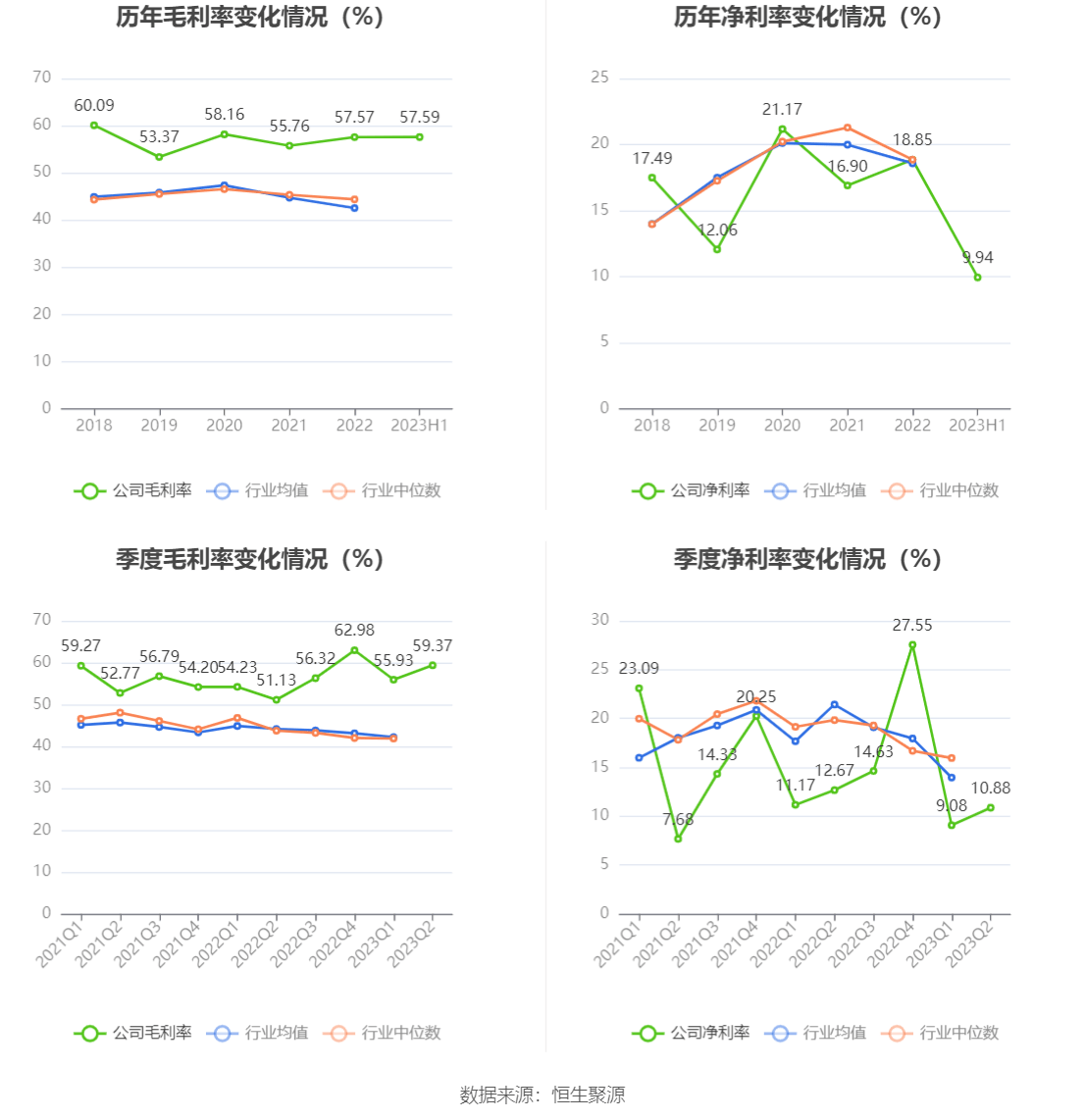 2023年上半年,公司毛利率为57.59%,同比上升4.91个百分点;净利率为9.94%,较上年同期下降1.98个百分点。从单季度指标来看,2023年第二季度公司毛利率为59.37%,同比上升8.24个百分点,环比上升3.44个百分点;净利率为10.88%,较上年同期下降1.79个百分点,较上一季度上升1.80个百分点。