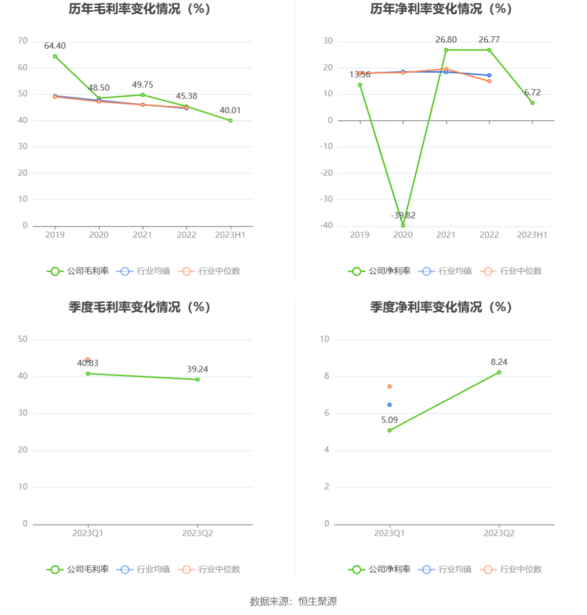 2023年上半年,公司毛利率为40.01%,同比下降8.59个百分点;净利率为6.72%,较上年同期下降24.50个百分点。从单季度指标来看,2023年第二季度公司毛利率为39.24%,同比下降9.59个百分点,环比下降1.59个百分点;净利率为8.24%,较上年同期下降25.65个百分点,较上一季度上升3.15个百分点。
