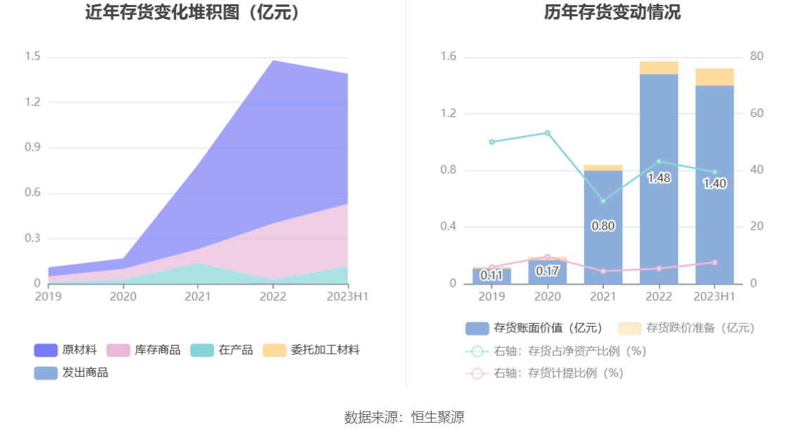 从存货变动来看,截至2023年上半年末,公司存货账面价值为1.4亿元,占净资产的39.51%,较上年末减少851.71万元。其中,存货跌价准备为1151.51万元,计提比例为7.6%。
