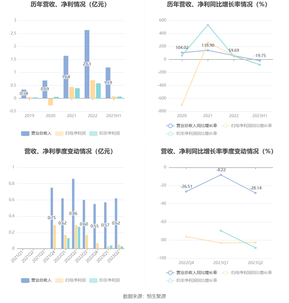 根据半年报,公司第二季度实现营业总收入6172.27万元,同比下降28.14%,环比增长7.61%;归母净利润508.39万元,同比下降82.53%,环比增长74.10%;扣非净利润306.58万元,同比下降88.46%,环比下降24.96%。