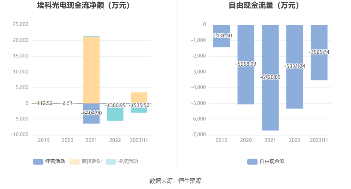 进一步统计发现,2023年上半年公司自由现金流为-3525.74万元,上年同期为-5674.41万元。
