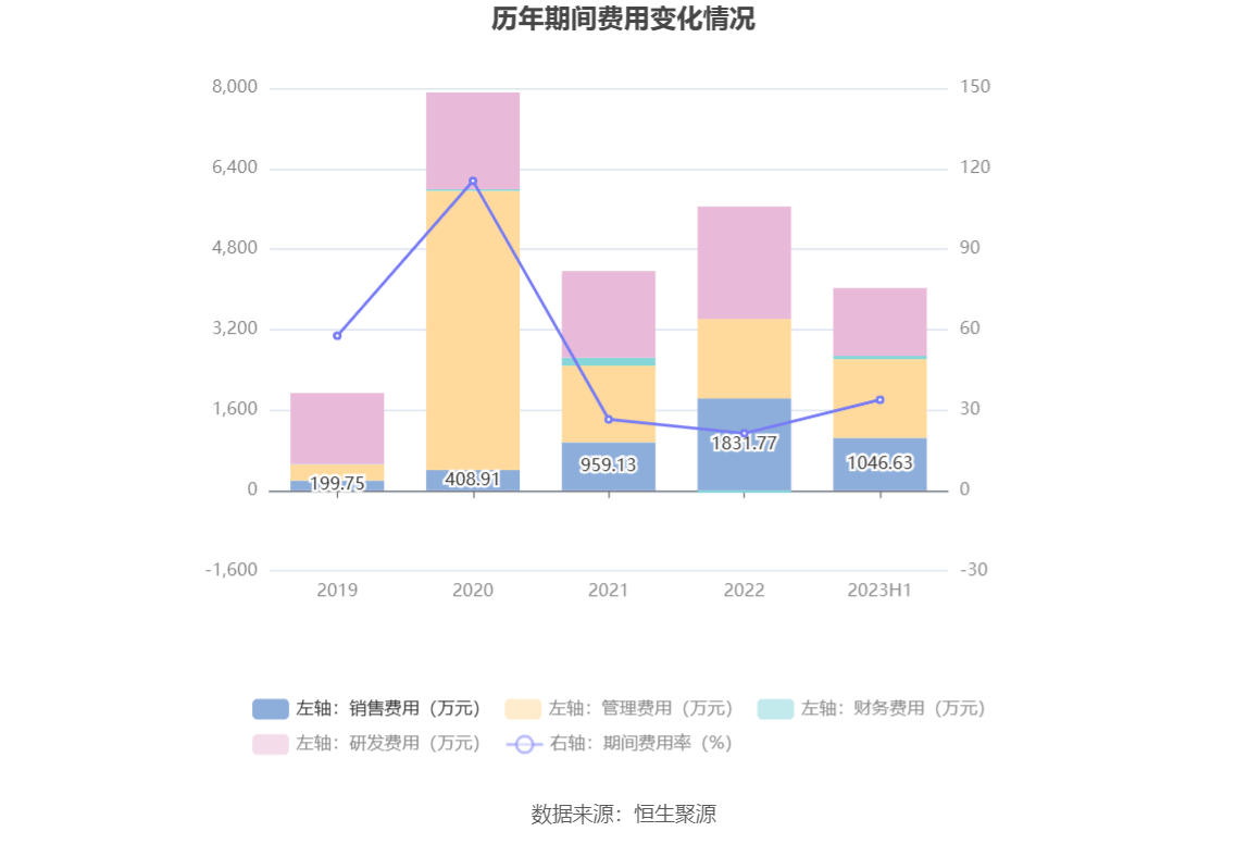 2023年上半年,公司期间费用为4026.93万元,较上年同期增加1410.59万元;期间费用率为33.82%,较上年同期上升16.19个百分点。其中,销售费用同比增长43.74%,管理费用同比增长145.76%,研发费用同比增长8.2%,财务费用同比增长1625.53%。
