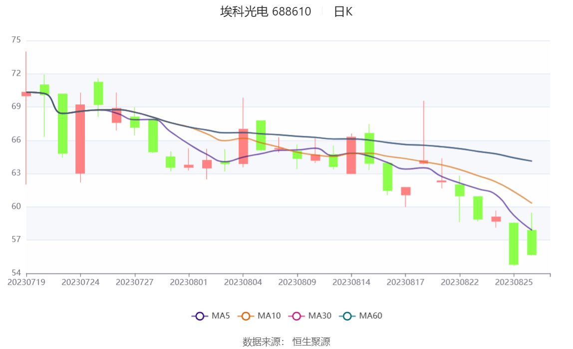 中证智能财讯 埃科光电(688610)8月29日披露2023年半年度报告。2023年上半年,公司实现营业总收入1.19亿元,同比下降19.75%;归母净利润800.39万元,同比下降82.72%;扣非净利润715.14万元,同比下降82.13%;经营活动产生的现金流量净额为-1535.50万元,上年同期为-5705.95万元;报告期内,埃科光电基本每股收益为0.16元,加权平均净资产收益率为2.30%。