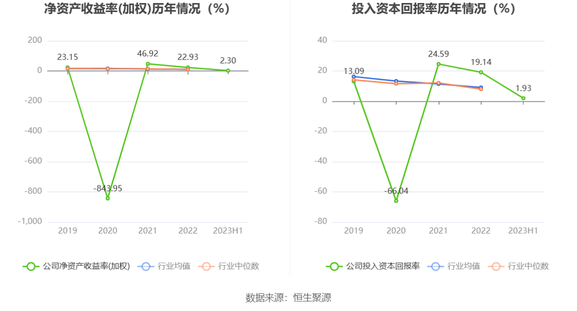 数据显示,2023年上半年公司加权平均净资产收益率为2.30%,较上年同期下降13.42个百分点;公司2023年上半年投入资本回报率为1.93%,较上年同期下降12.04个百分点。