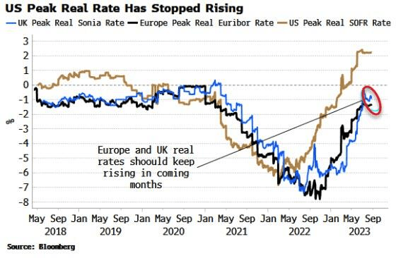 英国和欧洲的实际利率正迅速赶上美国,但仍低于零。不过,基于预期短期利率和CPI固定掉期的水平,英国央行和欧洲央行的实际政策利率到10月份都将转为正值。