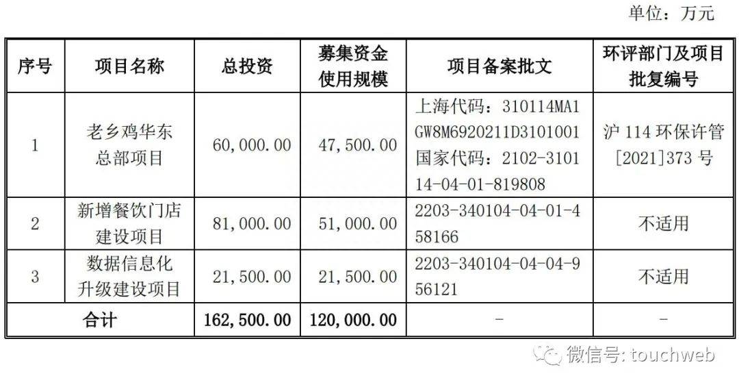 老乡鸡原计划募资12亿元,其中,4.75亿元用于老乡鸡华东总部项目,5.1亿元用于新增餐饮门店建设项目,2.15亿元用于数据信息化升级建设项目。