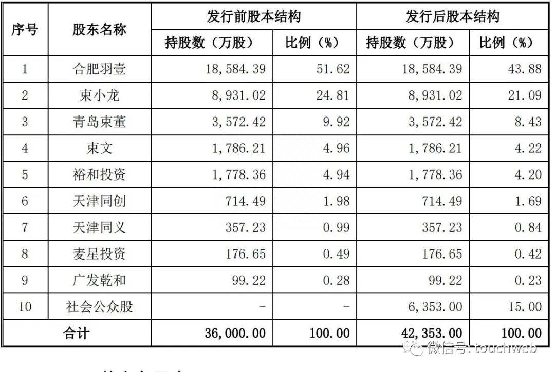IPO后,合肥羽壹持股为43.88%,束小龙持股为21.09%,青岛束董持股为8.43%,束文持股为4.22%,裕和投资持股为4.2%,天津同创持股为1.69%。