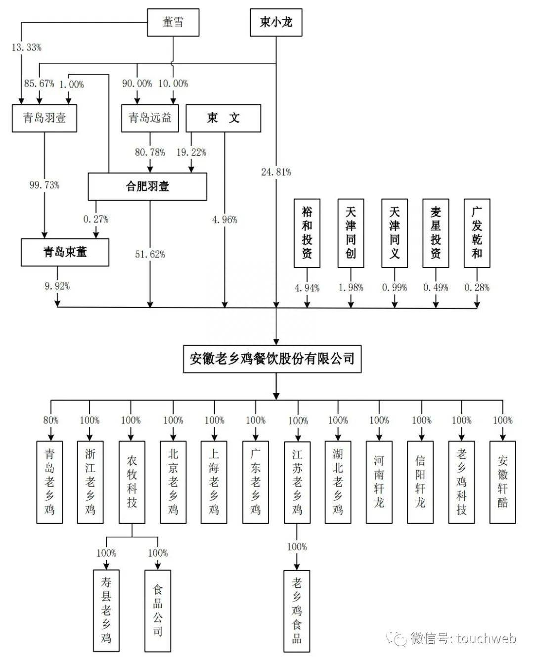 束小龙、董雪系夫妻关系,束小龙与束文系兄妹关系,三人合计持有老乡鸡91.32%的股份。