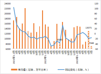 7月全国房地产新开工面积和施工面积分别为7089.6万平方米和8134.0万平方米,同比分别下降25.9%和22.9%,降幅较上月分别收窄4.4个百分点和3.9个百分点。我们认为新开工面积和施工面积保持双位数的大幅负增主要有以下两点原因:一是二季度以来楼市走弱,带动市场投资意愿下降,近期销售端出现加速下滑,对投资信心形成更深层次打击;二是近期碧桂园等龙头房企信用风险事件的爆发,对市场形成较大震动,进一步抑制了房企的投资意愿。竣工方面,7月全国房地产竣工面积为4501.3万平方米,同比增长33.1%,增速较上月扩大约16.8个百分点,“保交楼”政策仍在稳步推进。