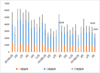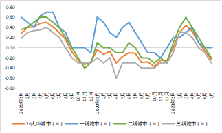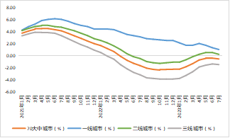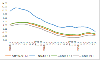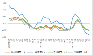 7月,70城新建商品住宅价格环比下降城市数量持续增多,环比跌幅持续扩大。70大中城市中价格环比上涨城市数量由上月的31个减少至20个,环比下降城市数量由38个增至49个。具体看,7月70城新建商品住宅价格同比下降0.57%,降幅较6月扩大0.14个百分点;环比下降0.23%,降幅较6月扩大0.17个百分点。分城市能级看,一线城市7月价格与上月持平,已连续两个月保持持平;二三线城市环比分别下跌0.2%和0.3%,跌幅较上月分别扩大0.2个百分点。