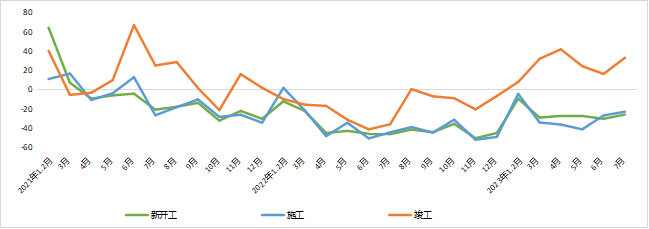 图表8:2021年-2023年7月全国房屋新开工、施工和竣工面积单月同比变化(单位:%)
