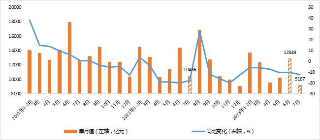 图表7:2021年至2023年7月全国房地产开发投资完成额及同比变化