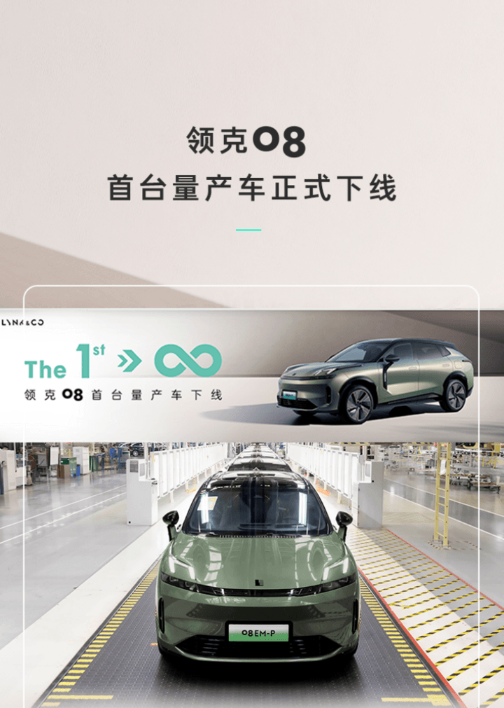 8月28日,领克汽车宣布领克08首台量产车正式下线,将于9月8日上市。领克 08共推出 120 长续航 Pro、120 长续航 Halo、245 超长续航 Halo、220 四驱性能 Halo 四款车型,预售价区间为 21.8-27.8 万元。领克08配备了39.6kWh超大平板电池,CLTC工况纯电续航里程245km,综合续航里程1400km。领克08搭载EM-P超级增程电动方案,将支持三电机四驱。(第一电动)