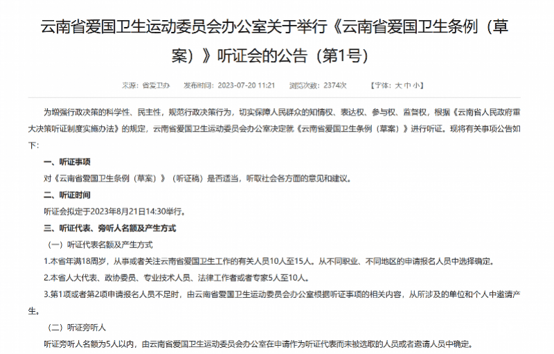 今年7月,云南省爱卫办发布听证会公告,招募听证代表和旁听人员。