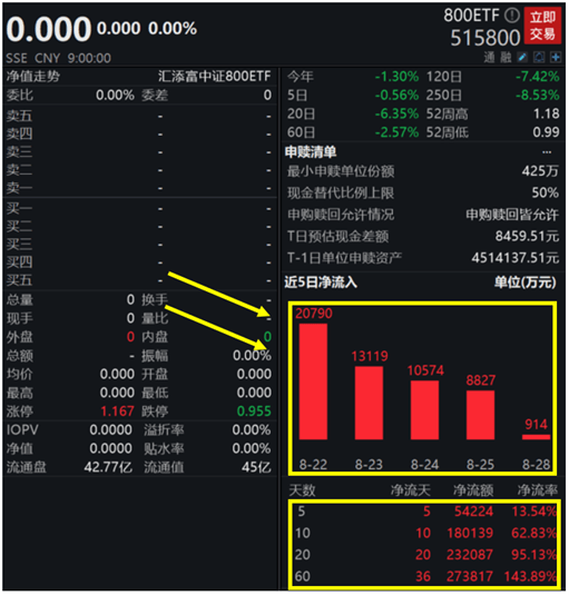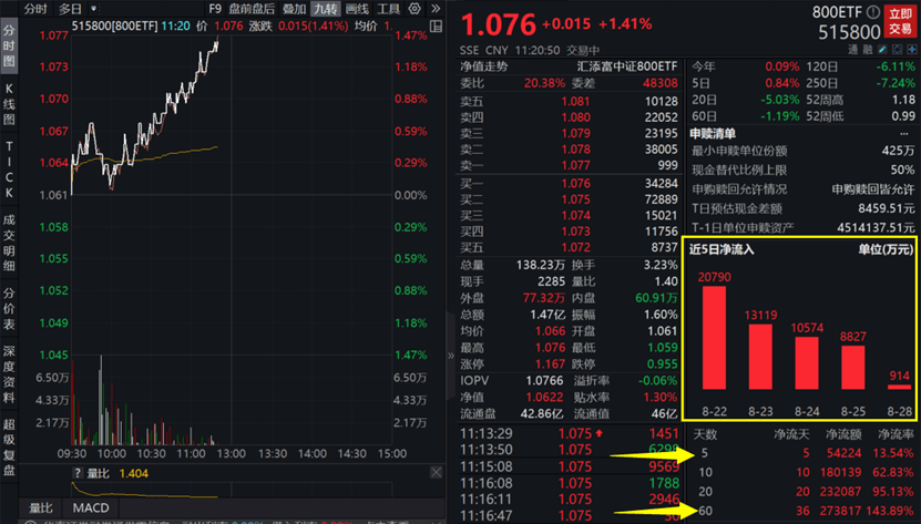 最近800ETF(515800)的巨量资金净流入,可能也从侧面验证,在目前这个位置,市场对于中证800这一A股主流宽基指数的偏好。