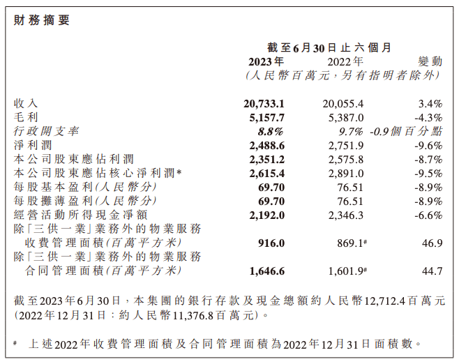 碧桂园服务8月29日午间在港交所公告,截至2023年6月30日止六个月,总收入同比增加约3.4%至约人民币207.331亿元。期内,集团的净利润约人民币24.886亿元,同比下降约9.6%。期内,公司股东应占利润约人民币23.512亿元,同比下降约8.7%。截至2023年6月30日,集团的银行存款及现金总额约人民币127.124亿元(2022年12月31日:约人民币113.768亿元)。董事会决议不宣派截至2023年6月30日止六个月的任何中期股息。