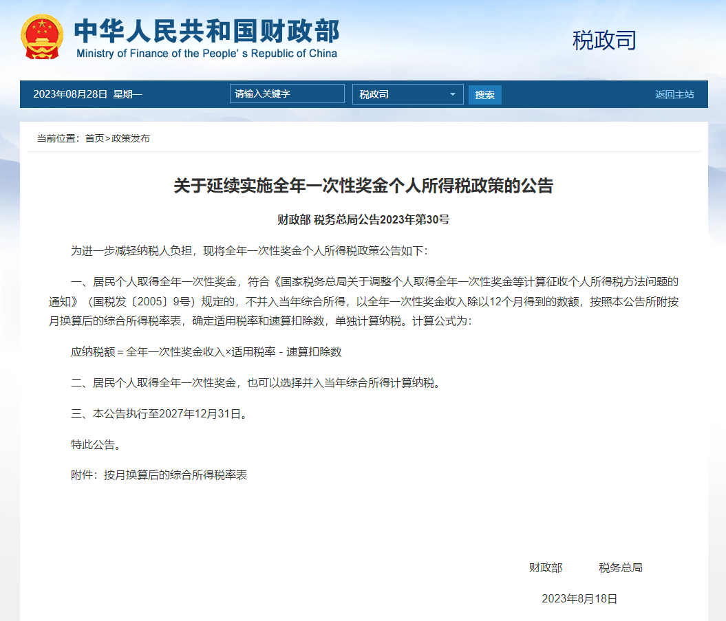 关于延续实施全年一次性奖金个人所得税政策的公告