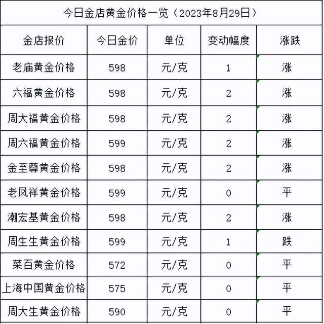 今天是8月29日,金店黄金价格恢复上涨,好在涨的不多,在2元/克左右,继续在600元/克附近徘徊,整体金价依旧很高。目前,金价最高的金店为周六福、老凤祥、周生生,分别微涨2元/克、不涨不跌,微跌1元/克,报价599元/克。而金价最低的金店则是菜百,不涨不跌,报价572元/克。今日黄金价格高低差为27元/克,价差较大。