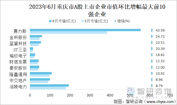 2023年6月重庆市A股上市企业市值环比增幅最大前10强企业