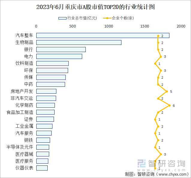 据同花顺统计数据可知:重庆市的A股上市企业涵盖43个行业,6月新上市的家企业分别从事汽车零部件、生物制品、医疗器械;43个行业中汽车整车行业的总市值最高,其总市值为1836.83亿元,占全省A股上市企业总市值比重为18.46%;市值TOP20的行业中从事化学制药行业的企业最多,共计6家,占全省A股上市企业总市值比重为8.11%。