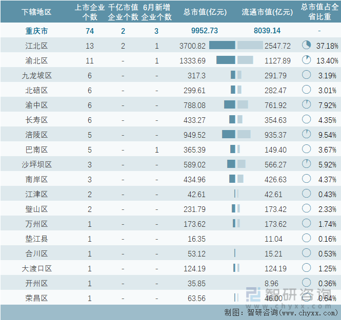 据同花顺统计数据可知:2023年6月,重庆市新增智翔金泰-U、西山科技、C溯联3家企业在A股上市,截止至2023年6月30日,重庆市的A股上市企业共计74家,上市企业数量排名全国第17,总市值共计9952.73亿元;重庆市有2家A股上市企业市值超千亿元,数量排名全国第12,其总部均在江北区;江北区A股上市企业总市值总流通市值均为最高。