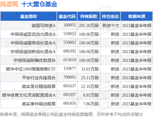 根据2023基金半年报公募基金重仓股数据,重仓该股的公募基金共20家,其中持有数量最多的公募基金为富国可转债A。富国可转债A目前规模为38.01亿元,最新净值1.984(8月28日),较上一交易日上涨0.15%,近一年下跌9.13%。该公募基金现任基金经理为张明凯 祝祯哲。张明凯在任的基金产品包括:富国收益增强债券A,管理时间为2019年3月19日至今,期间收益率为24.61%;富国天丰强化债券(LOF),管理时间为2019年3月19日至今,期间收益率为27.95%;富国利享回报12个月持有混合A,管理时间为2022年4月26日至今,期间收益率为-3.61%。祝祯哲在任的基金产品包括:富国利享回报12个月持有混合A,管理时间为2023年6月16日至今,期间收益率为-2.38%。