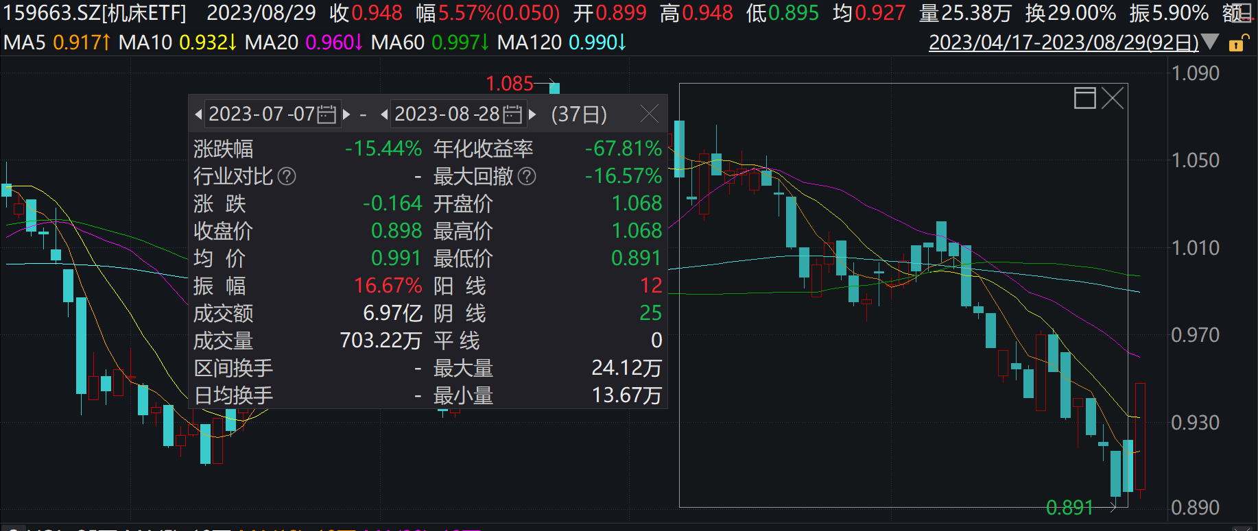 截至8月28日收盘,机床ETF(159663)二级市场价格自7月7日调整以来,累计下跌达15.44%,上周五盘中创近期年内新低0.891元,昨日高开后持续走低,仅小幅收涨。今日迎来大幅反弹,可以布局了吗?