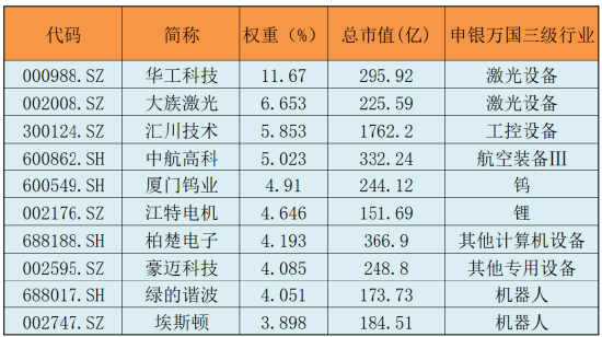 中证机床指数,涉及机床整机及数控系统、主轴、切削工具等关键零部件的设计、制造和服务等领域,前十大成分股权重达54.98%,包含了华工科技、大族激光、绿的谐波、汇川技术、中航高科、厦门钨业、江特电机、柏楚电子、绿的谐波等行业龙头股票。