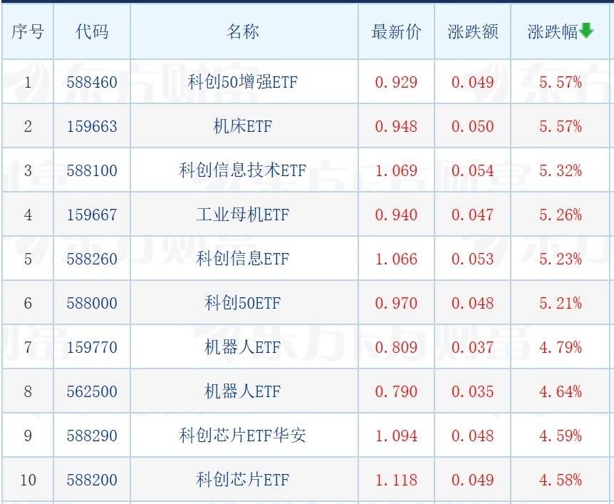 ETF方面,科创50、科创信息、机床等相关ETF大涨超5%,机器人、科创芯片等ETF涨超4%。