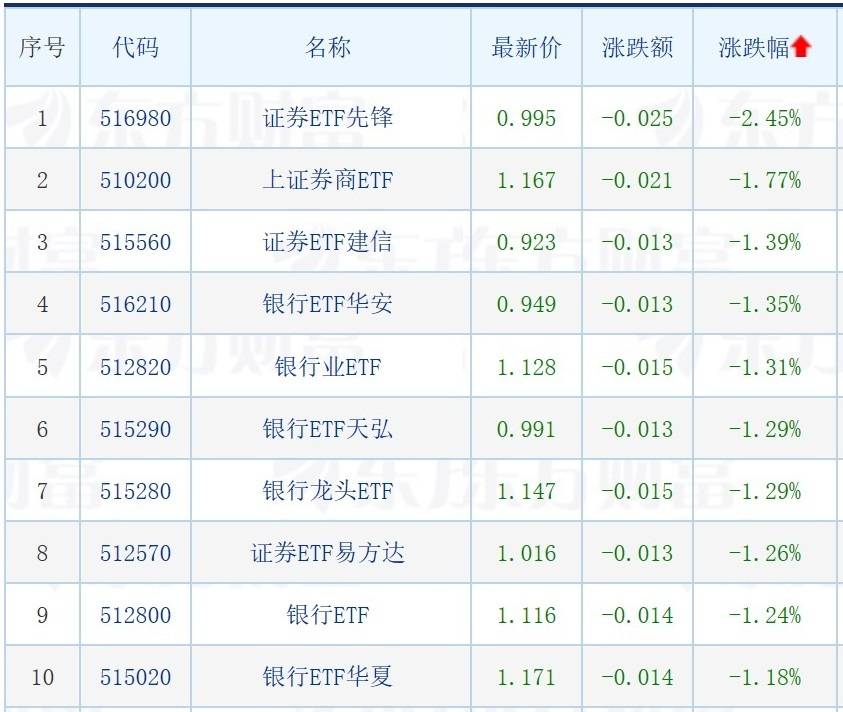 下跌方面,大金融板块疲软,证券、银行相关ETF跌逾1%。