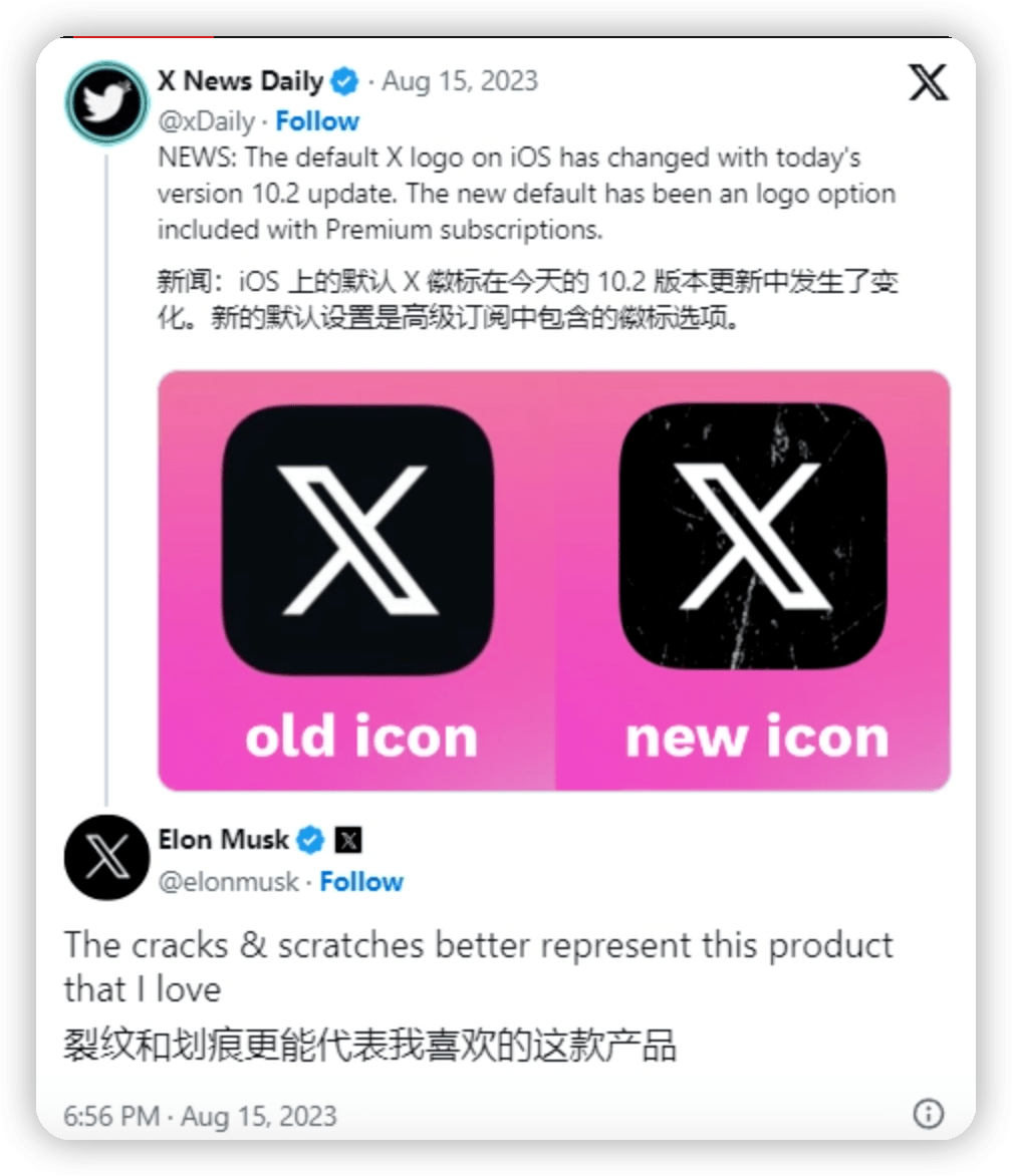 没过几天,X App 的图标又发生了变化,新增了一些白色的「破损」效果。