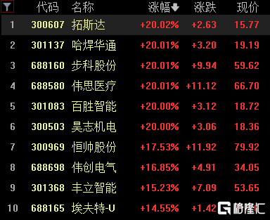 机器人板块掀涨停潮,拓斯达、哈焊华通、步科股份、百胜智能、昊志机电等多股20cm涨停,伟创电气、丰立智能等跟涨。