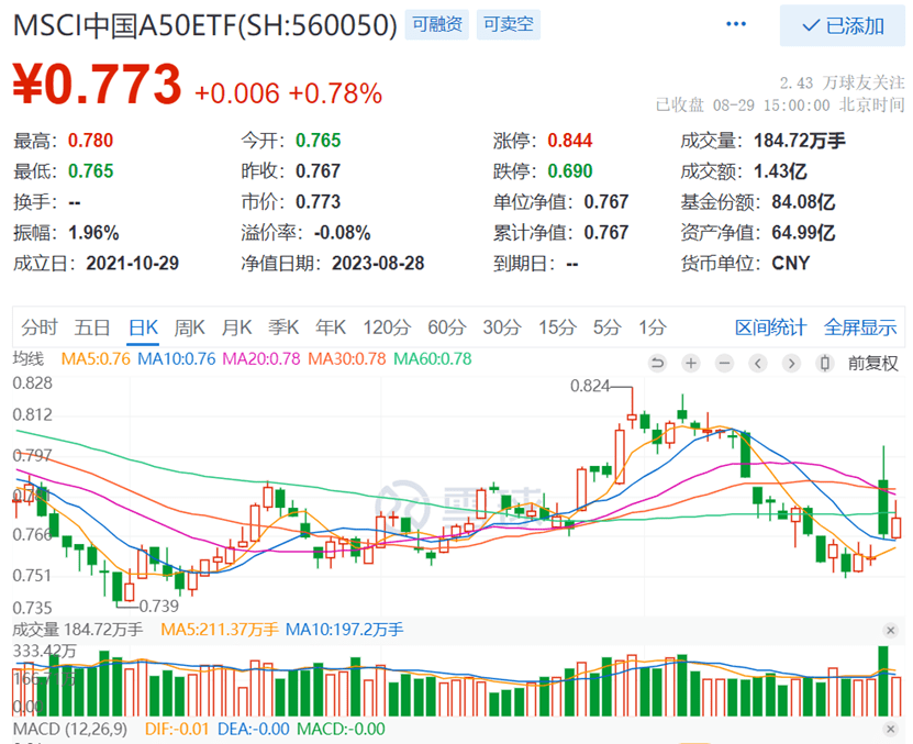 热门ETF方面,核心龙头宽基MSCI中国A50ETF(560050)低开后稳步走高,早盘一度涨超1.5%,午后回落最终收涨0.78%,成交额1.43亿元,大幅缩量。