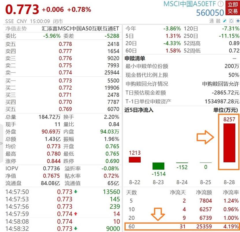 上交所数据显示,MSCI中国A50ETF(560050)昨日获资金大幅净流入8257万元!近60日内吸金近2.54亿元,最新规模超64.5亿元,高居同类第一!