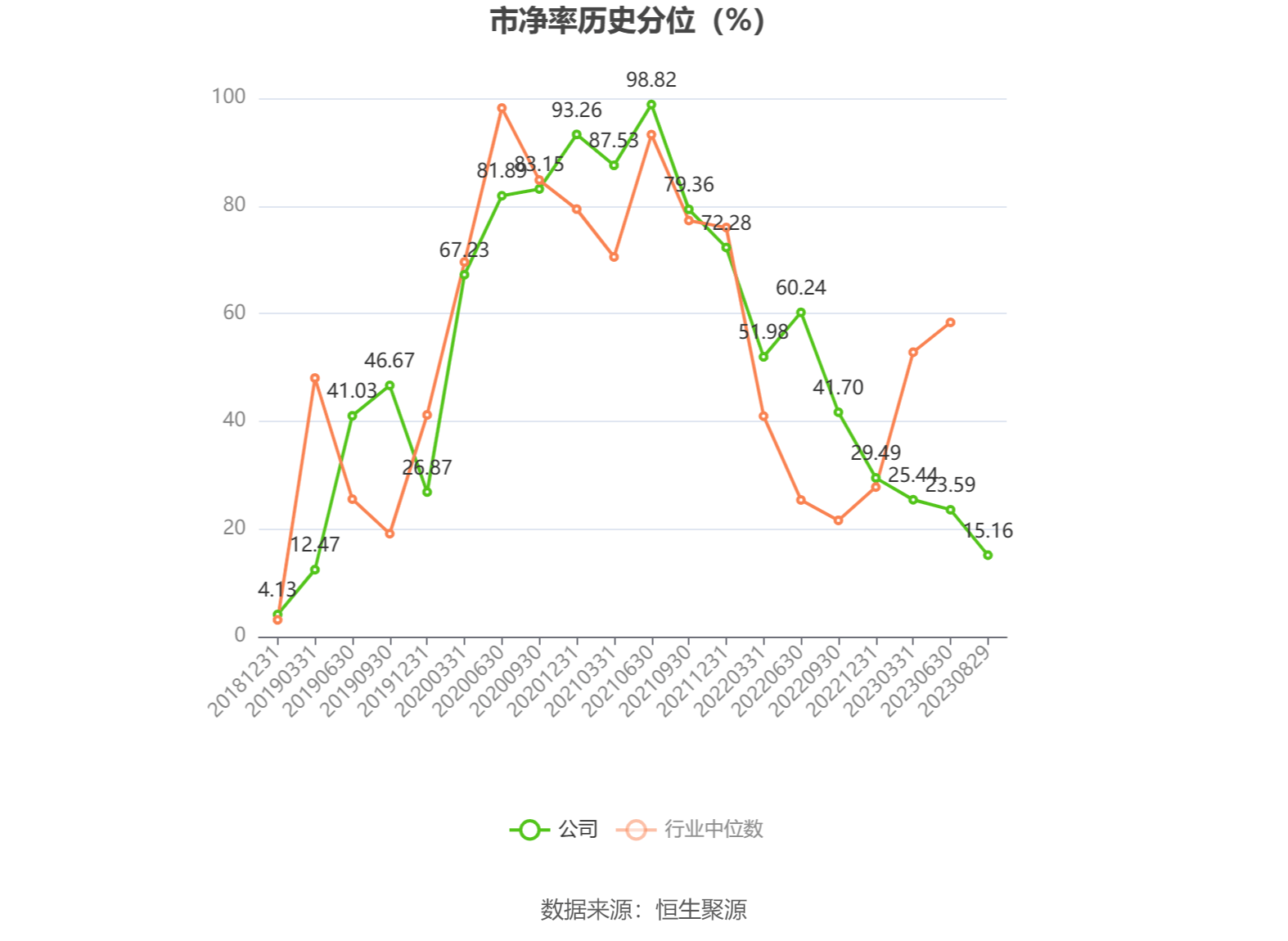 市盈率为负时,不显示当期分位数,会导致折线图中断。