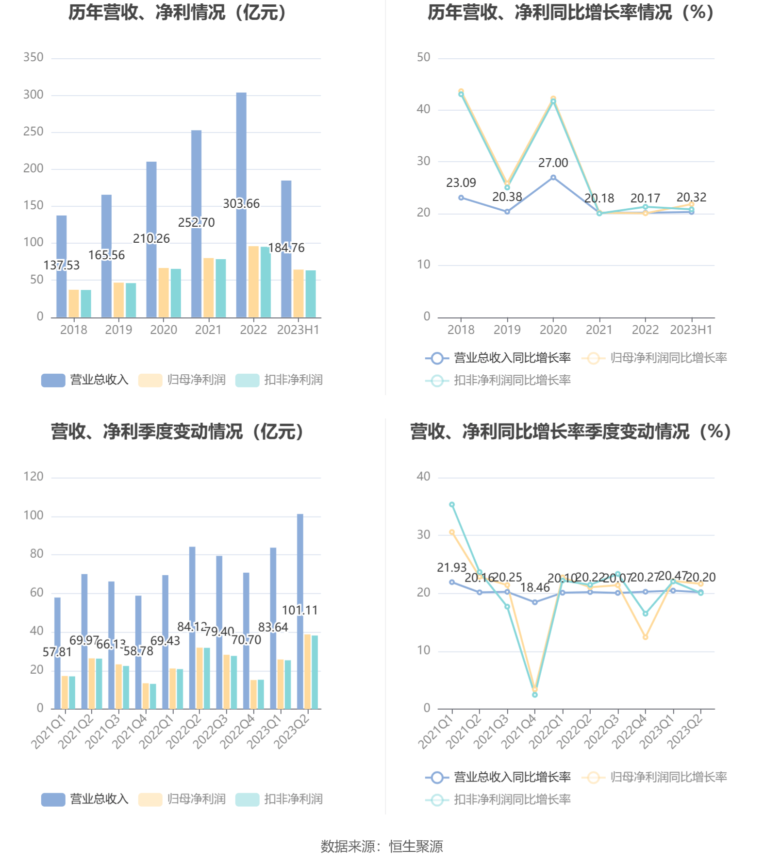 根据半年报,公司第二季度实现营业总收入101.11亿元,同比增长20.20%,环比增长20.89%;归母净利润38.71亿元,同比增长21.63%,环比增长50.55%;扣非净利润38.12亿元,同比增长20.05%,环比增长50.71%。