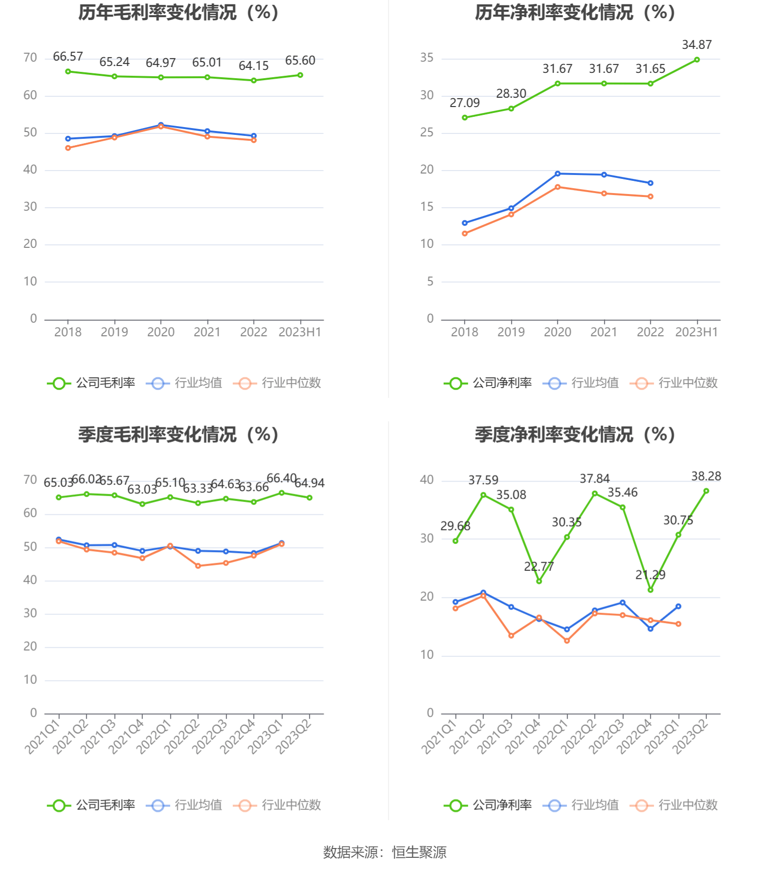 2023年上半年,公司毛利率为65.60%,同比上升1.47个百分点;净利率为34.87%,较上年同期上升0.42个百分点。从单季度指标来看,2023年第二季度公司毛利率为64.94%,同比上升1.61个百分点,环比下降1.46个百分点;净利率为38.28%,较上年同期上升0.44个百分点,较上一季度上升7.53个百分点。