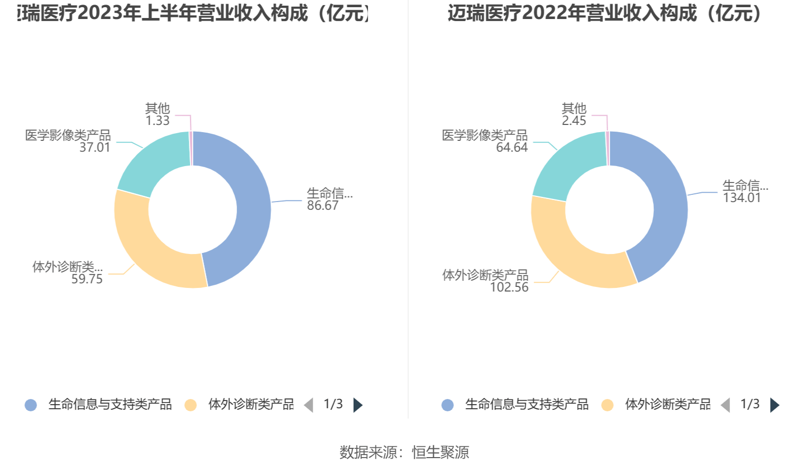 分产品来看,2023年上半年公司主营业务中,生命信息与支持类产品收入86.67亿元,同比增长27.99%,占营业收入的46.91%;体外诊断类产品收入59.75亿元,同比增长16.18%,占营业收入的32.34%;医学影像类产品收入37.01亿元,同比增长13.40%,占营业收入的20.03%。