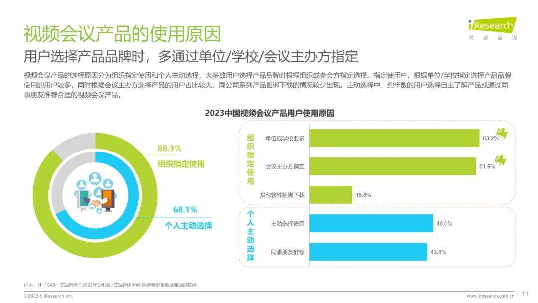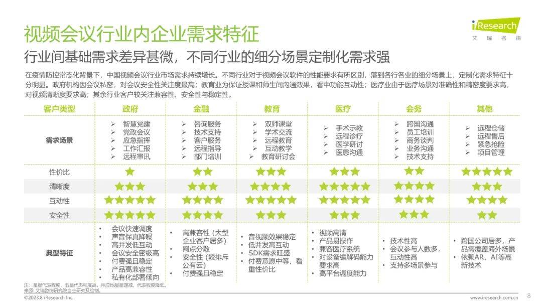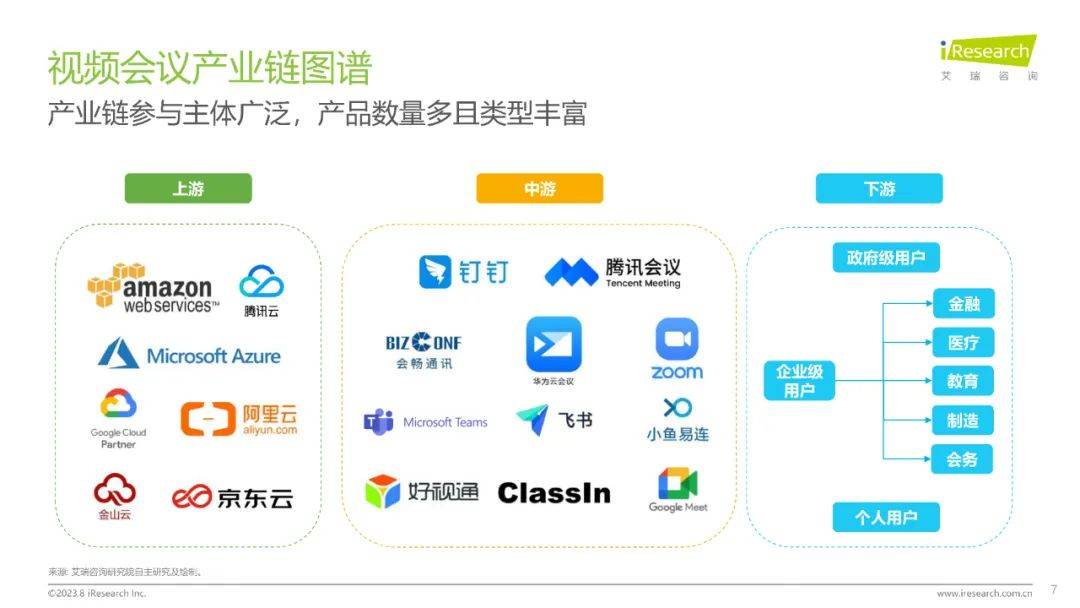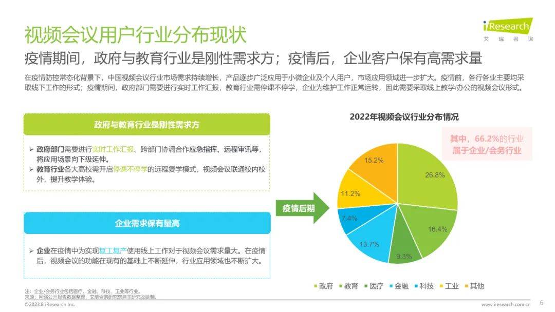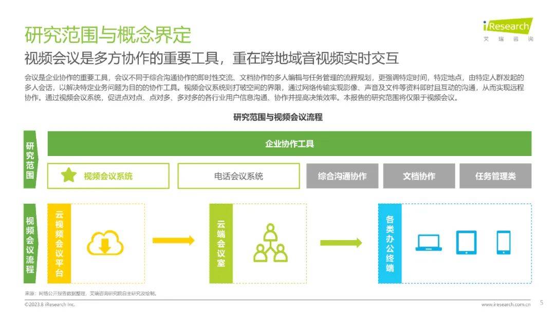 会议是企业协作的重要工具,会议不同于综合沟通协作的即时性交流、文档协作的多人编辑与任务管理的流程规划,更强调特定时间,特定地点,由特定人群发起的多人会话,以解决特定业务问题为目的的协作工具。视频会议系统则打破空间的界限,通过网络传输实现影像、声音及文件等资料即时且互动的沟通,从而实现远程协作。通过视频会议系统,促进点对点、点对多、多对多的各行业用户信息沟通、协作并提高决策效率。本报告的研究范围将仅限于视频会议。