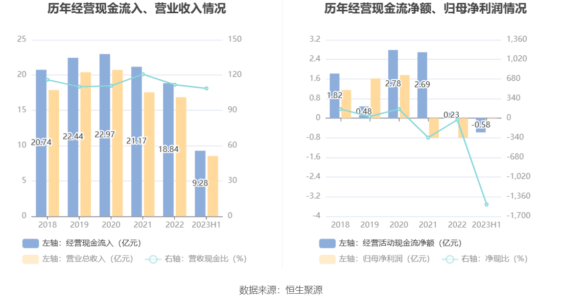 2023年上半年,公司营业收入现金比为108.64%,净现比为-1494.84%。