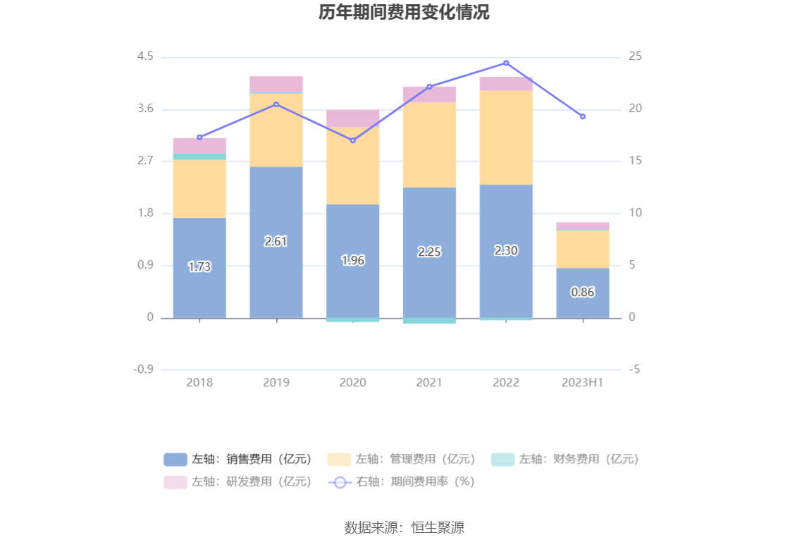 2023年上半年,公司期间费用为1.65亿元,较上年同期减少1046.61万元;但期间费用率为19.31%,较上年同期上升0.71个百分点。其中,销售费用同比下降17.0%,管理费用同比增长3.73%,研发费用同比增长1.0%,财务费用由去年同期的-247.97万元变为217.04万元。