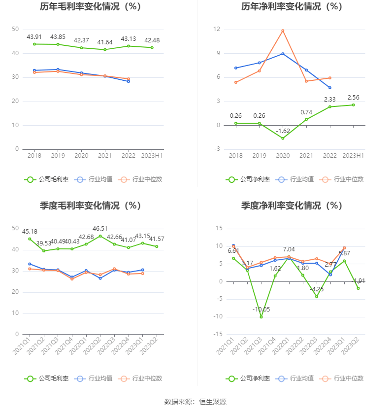 2023年上半年,公司毛利率为42.48%,同比下降1.85个百分点;净利率为2.56%,较上年同期下降2.22个百分点。从单季度指标来看,2023年第二季度公司毛利率为41.57%,同比下降4.94个百分点,环比下降1.58个百分点;净利率为-1.91%,较上年同期下降3.71个百分点,较上一季度下降7.78个百分点。