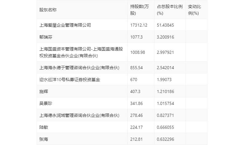 半年报显示,2023年上半年末的公司十大流通股东中,新进股东为吴景珍、陆敏、张海,取代了一季度末的汪小明、周汉军、海南顺盈裕盛投资咨询合伙企业(有限合伙)。在具体持股比例上,上海国盛资本管理有限公司-上海国盛海通股权投资基金合伙企业(有限合伙)持股有所上升,上海爱屋企业管理有限公司持股有所下降。