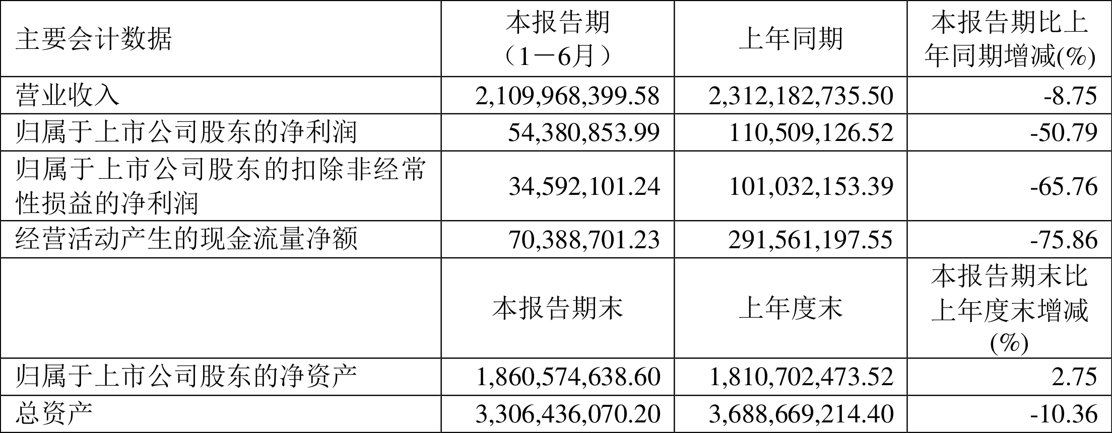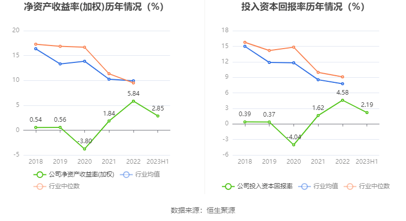 数据显示,2023年上半年公司加权平均净资产收益率为2.85%,较上年同期下降3.46个百分点;公司2023年上半年投入资本回报率为2.19%,较上年同期下降2.78个百分点。