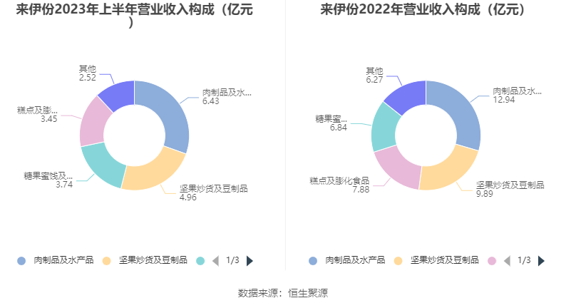 分产品来看,2023年上半年公司主营业务中,肉制品及水产品收入6.43亿元,同比下降11.41%,占营业收入的30.49%;坚果炒货及豆制品收入4.96亿元,占营业收入的23.50%;糖果蜜饯及果蔬收入3.74亿元,占营业收入的17.71%。