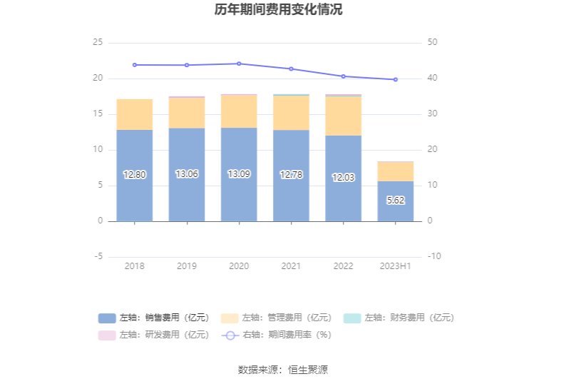 2023年上半年,公司期间费用为8.37亿元,较上年同期减少5502.19万元;但期间费用率为39.69%,较上年同期上升1.09个百分点。其中,销售费用同比下降6.15%,管理费用同比下降5.25%,研发费用同比下降4.17%,财务费用同比下降54.48%。