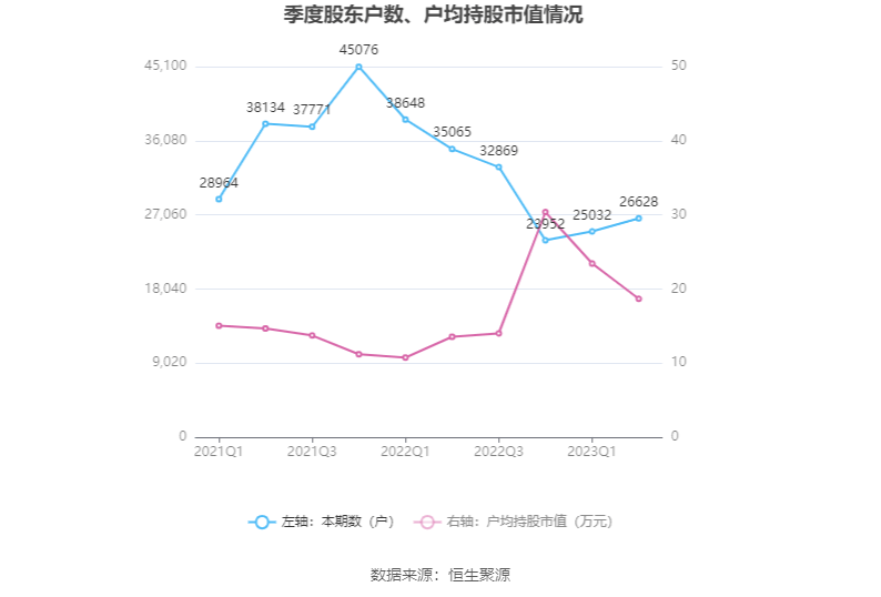 筹码集中度方面,截至2023年二季度末,公司股东总户数为2.66万户,较一季度末增长了1596户,增幅6.38%;户均持股市值由一季度末的23.42万元下降至18.66万元,降幅为20.32%。