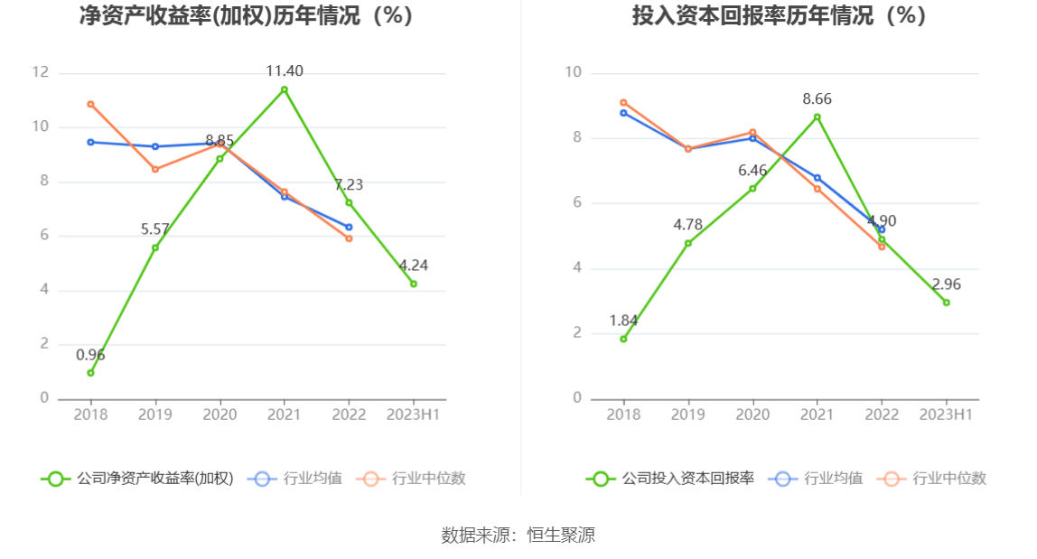 数据显示,2023年上半年公司加权平均净资产收益率为4.24%,较上年同期下降0.09个百分点;公司2023年上半年投入资本回报率为2.96%,较上年同期下降0.18个百分点。