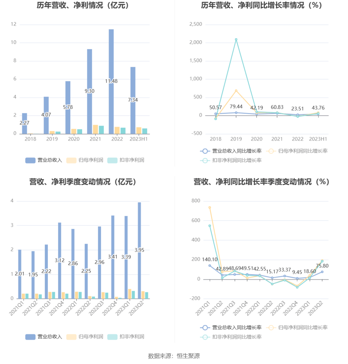 根据半年报,公司第二季度实现营业总收入3.95亿元,同比增长75.80%,环比增长16.44%;归母净利润3149.14万元,同比增长191.80%,环比下降22.15%;扣非净利润2669.15万元,同比增长184.74%,环比下降17.66%。